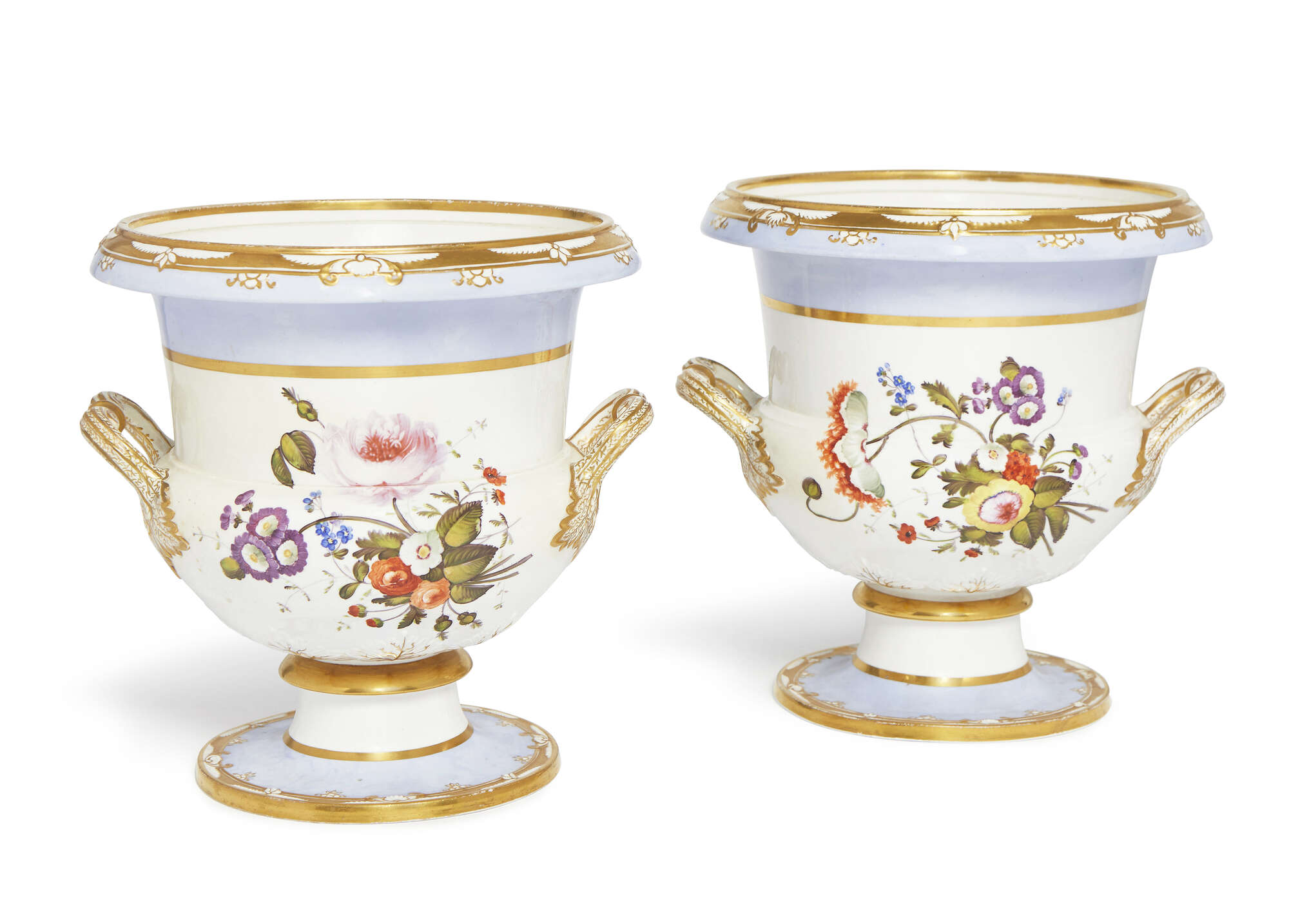 A pair of Spode porcelain Campana type urns, early 19th century, decorated with reserves of flowers and leaves on white grounds between pale blue and gilt banding, marks of Spode to the base of one, 23.5cm high (2)