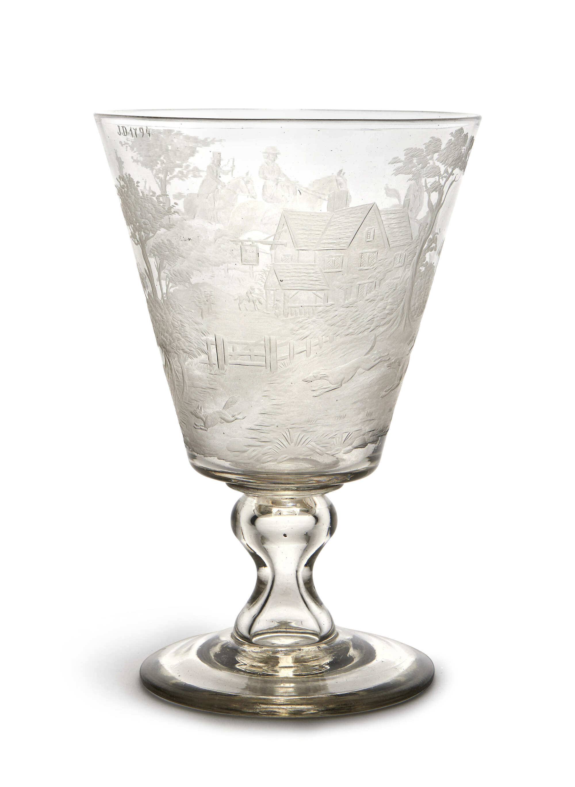 An English engraved Hunting glass goblet, 18th century, engraved with a continuous hunting scene to the tapering body, initialled and dated JD 1794, 19.5cm high