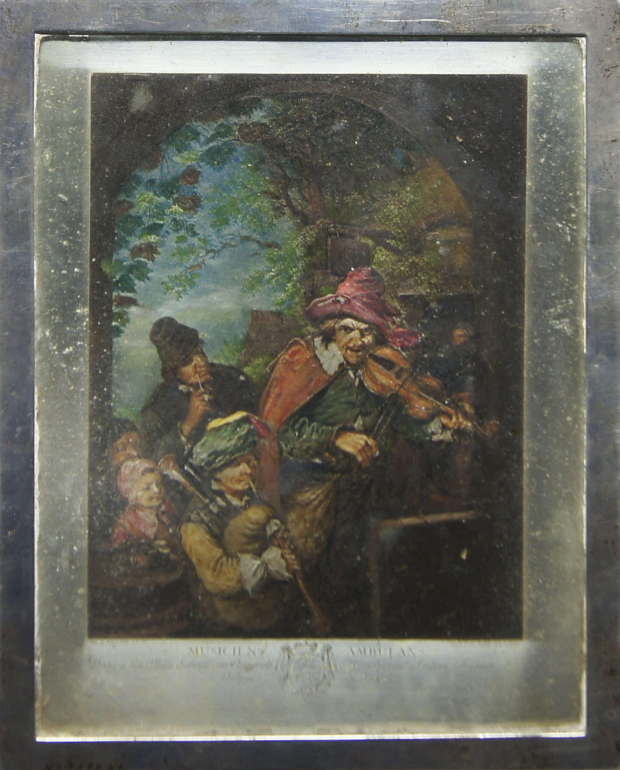 A silver cigarette box, London, c.1927, Mappin & Webb, of rectangular form, the hinged cover inset with hand coloured silver plaque of 'Musiciens Ambulans' after Christian Wilhelm Ernst Dietrich, 5.5cm high x 16.6cm long x 13.5cm wide, together with a William IV Scottish silver toddy ladle, Edinburgh c.1830, with writhen handle, a further toddy ladle and a silver handled shoe horn (4)