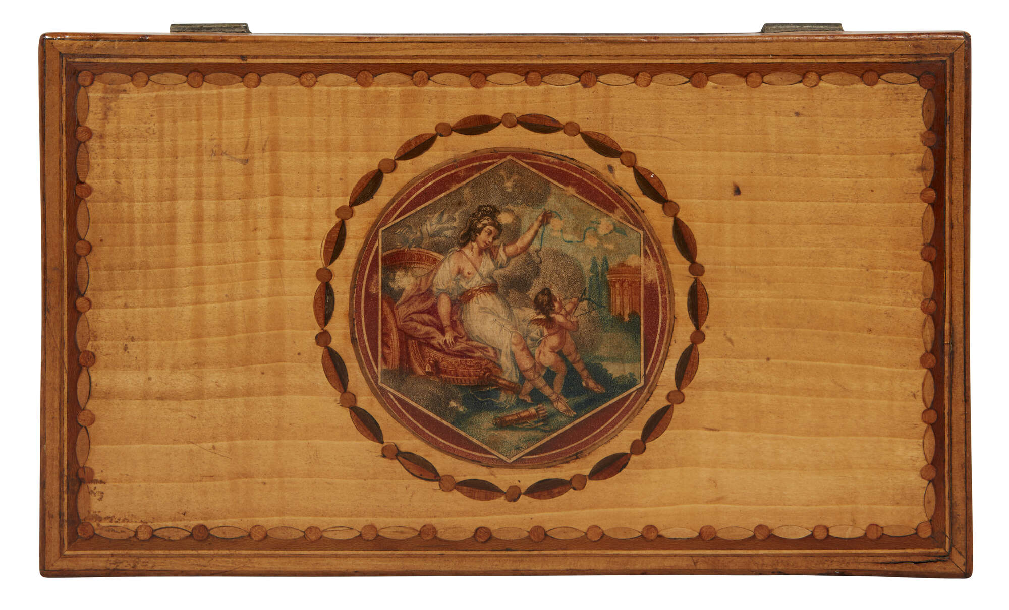 A painted pale satinwood rectangular card box, 19th century, the lid decorated with a...