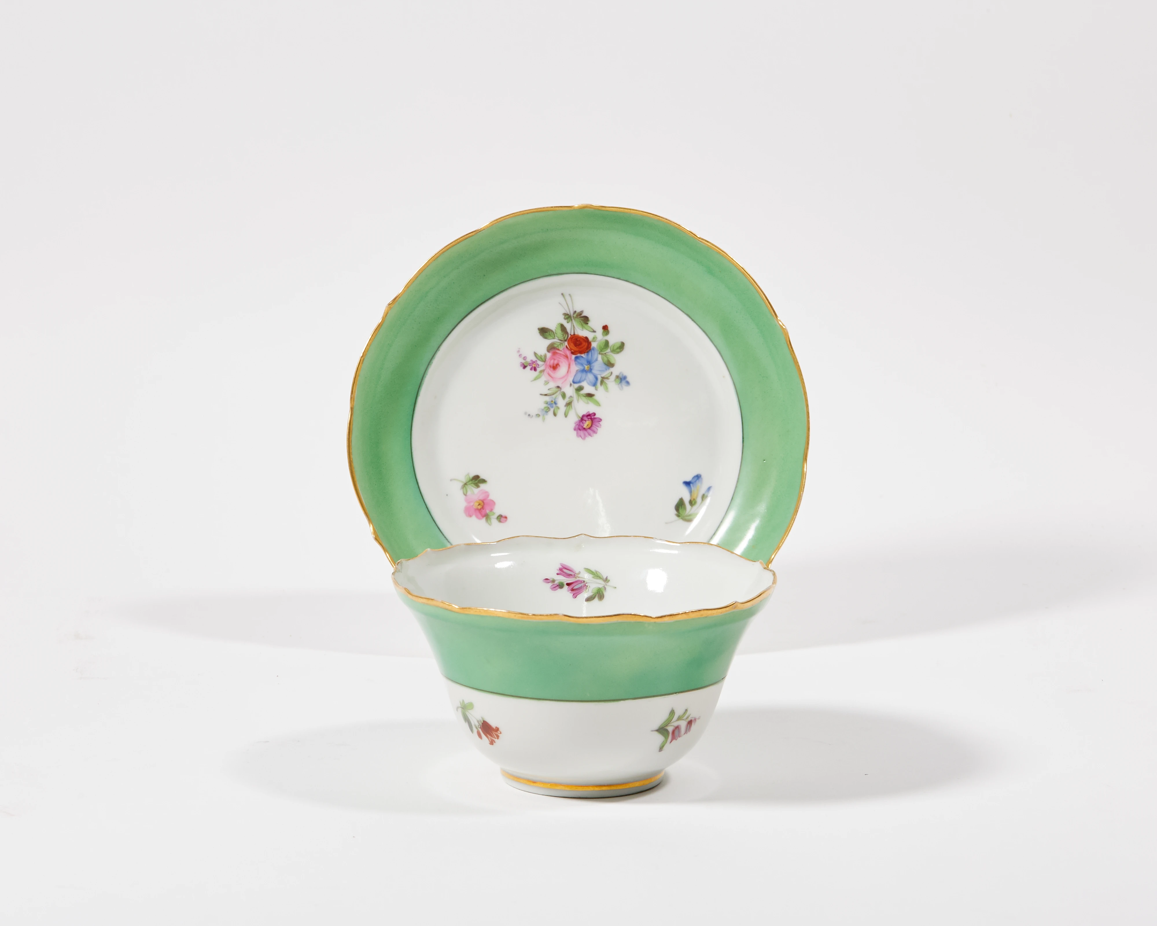 A Chinese porcelain English-decorated tea bowl and saucer, late 18th / early 19th century, the porcelain Jiaqing period, the decoration probably Chamberlain's Worcester, the bowl and saucer of ogee shape with shaped and scalloped gilded rims, painted with floral sprays and thick green border, the bowl 6.5cm high, the saucer 15.5cm diameter (2)