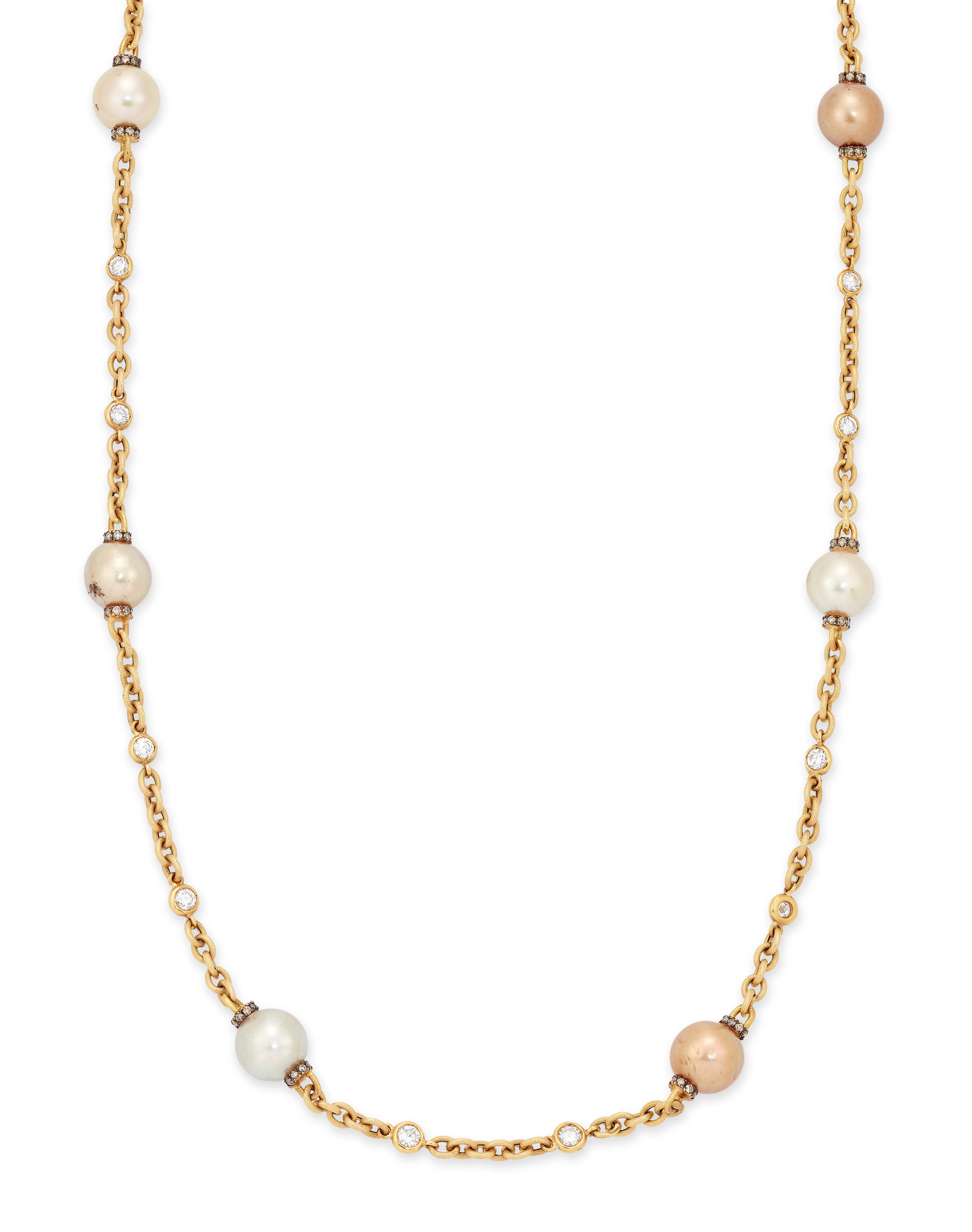 A South Sea cultured pearl and diamond necklace, designed as a series of vari-coloured South Sea cultured pearls with diamond set collars, joined by lengths of hollow textured trace-link chain with spectacle-set brilliant-cut diamond spacers, to trigger clasp, stamped 750, length approximately 97cm (VAT charged on hammer price)