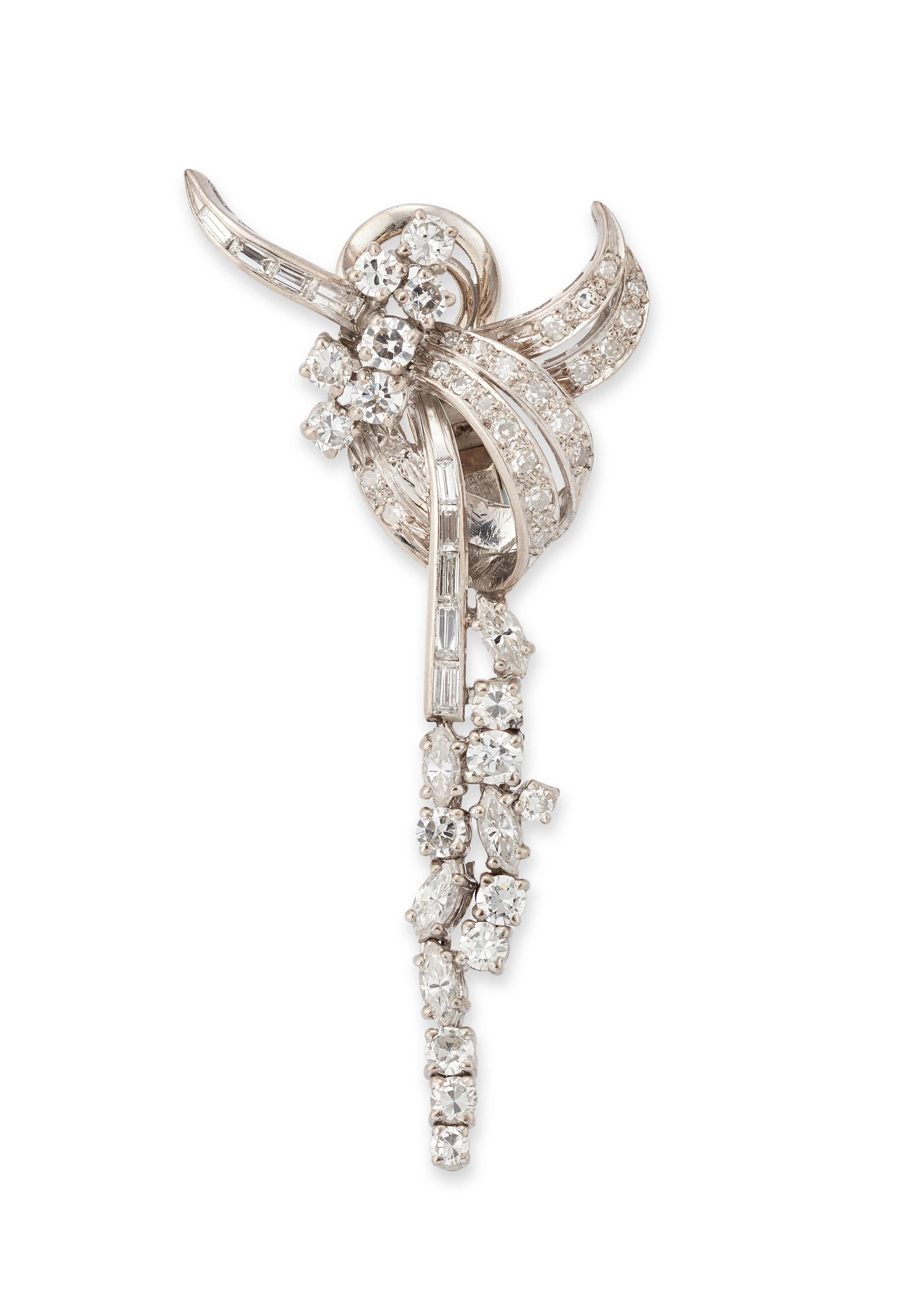 A single diamond set ear clip, designed as a brilliant-cut, single-cut and baguette-cut diamond spray, suspending a double articulated line of brilliant-cut and marquise-cut diamonds, to clip fitting, length 5.4cm (VAT charged on hammer price)